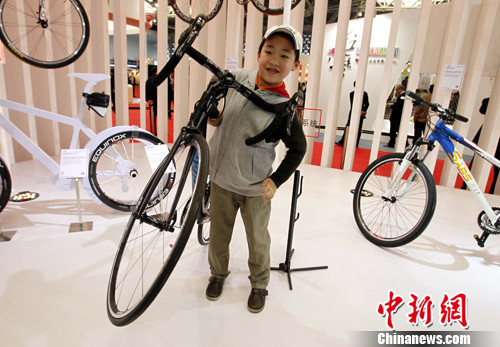 4月5日,2012上海臺(tái)灣名品博覽會(huì)在上海世博展覽館開幕,其中“臺(tái)灣精品館”10項(xiàng)創(chuàng)新產(chǎn)品擁有全球第一殊榮,成為各界矚目焦點(diǎn)。圖為用碳纖維制作的全世界最輕的自行車,僅六點(diǎn)七公斤,兒童也能輕易提起。 123,123