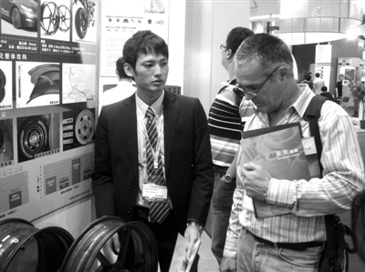 日本東麗公司是全球領(lǐng)先的碳纖維生產(chǎn)商,其產(chǎn)品是不少?lài)?guó)內(nèi)外客戶(hù)的首選。圖為日前在北京舉行的2010第十六屆中國(guó)國(guó)際復(fù)合材料工業(yè)技術(shù)展覽會(huì)上,一位美國(guó)采購(gòu)商與東麗公司日本技術(shù)人員正洽談碳纖維業(yè)務(wù)。                (本報(bào)記者 徐巖 攝)