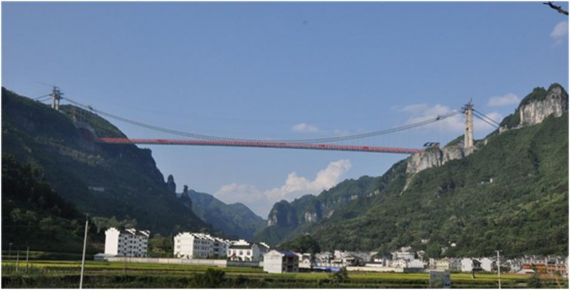 矮寨特大懸索橋是長(zhǎng)沙至重慶公路通道吉茶高速公路的控制性工程,距吉首市約20公里,在矮寨鎮(zhèn)上空355米處跨越德夯大峽谷,主跨跨徑1176米,是目前世界上跨峽谷跨徑最大的鋼桁梁懸索橋。大橋地處峽谷,峽谷總體呈V字型,兩側(cè)懸崖距離從900m到1300m變化,平均坡度達(dá)40度,最陡處懸崖直立,施工場(chǎng)地十分狹小,而且橋面與谷底垂直高差達(dá)330余米,施工難度大。也由此創(chuàng)下“四項(xiàng)世界第一”。