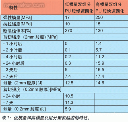 在汽車組裝過程中粘結(jié)部件時(shí),雙組分聚氨酯結(jié)構(gòu)膠比較合適。這種膠可以加工成具有不同模量和斷裂伸長(zhǎng)率。表1列出了兩種硬化率不同、彈性模量有低有高的雙組分聚氨酯結(jié)構(gòu)膠的性能曲線。