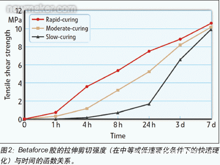 在標(biāo)準(zhǔn)氣候條件下,兩小時(shí)后沒有達(dá)到該拉伸剪切強(qiáng)度值。但是在加速條件下,1小時(shí)候即測(cè)得了達(dá)3.5MPa。樣本儲(chǔ)存于室溫條件下,強(qiáng)度僅為0.7 MPa。三天后,采用加速膠黏劑,達(dá)到了最終強(qiáng)度10.5MPa,而未經(jīng)加熱反應(yīng)的樣本,在7天后方達(dá)到該強(qiáng)度。