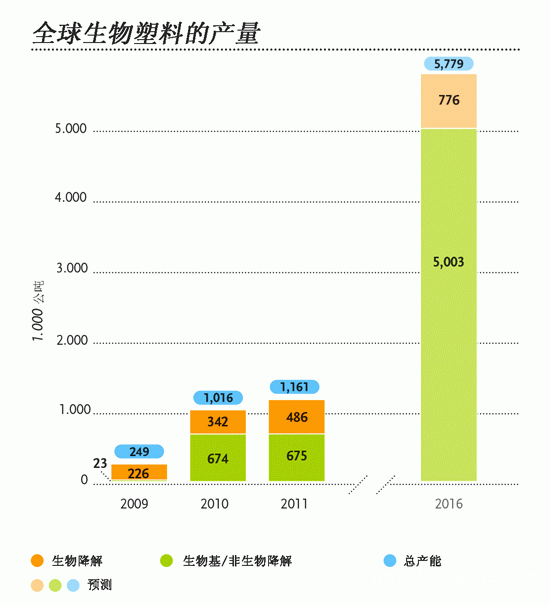 基于可再生原材料的塑料產(chǎn)量已經(jīng)有了快速的提升,雖然其總體水平相對(duì)于石油基塑料來說還比較低。據(jù)制造商協(xié)會(huì)European Bioplastics報(bào)道,2009年,生物降解塑料的產(chǎn)量大約有幾十萬噸,占生物塑料全球總產(chǎn)能的絕大部分份額。但是自2010年以來,生物基塑料的增長(zhǎng)速度已經(jīng)遠(yuǎn)遠(yuǎn)超過生物降解塑料。據(jù)該協(xié)會(huì)預(yù)測(cè),盡管生物降解塑料的產(chǎn)量在不斷增長(zhǎng),但到2016年,它們大約只能占到生物塑料總產(chǎn)量的七分之一。生物塑料中絕大部分將是生物基塑料,而不是生物降解塑料。 123456