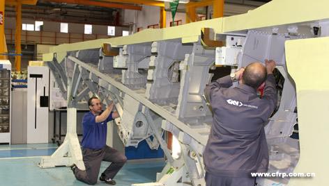 A380飛機已經交付數家用戶,其優(yōu)良性能和舒適性被廣為稱道。復材用于該機的部件有中央翼盒結構,尾翼結構,襟翼、副翼結構,擾流板結構,機身上壁板、機身地板梁(跨度6m)、機身后體球框(6.2m×5.5m,樹脂膜溶塑成型工藝RFI)、整流罩結構等。
