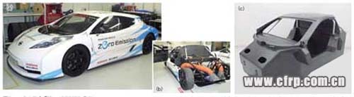 在賽車及跑車中使用最多的是將預(yù)浸料層疊并利用熱壓使其固化的熱塑性CFRP。比如,日產(chǎn)汽車的“LEAF”(中國名:聆風(fēng))的馬達(dá)、再比如將減速機中置的EV賽車“LEAF NISMO RC”演示款都使用預(yù)浸料制造了從駕駛室到通風(fēng)罩的絕大部分部件(圖1)。
