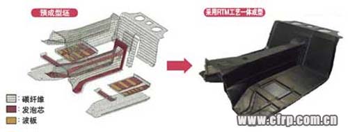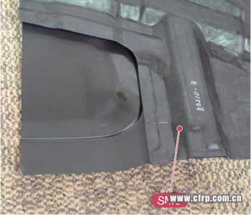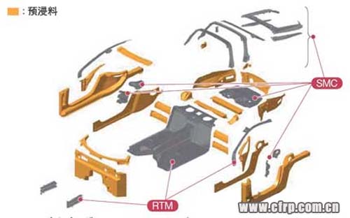 大部分采用預(yù)浸料工藝,地板、A柱及碰撞吸能盒采用RTM工藝制成。后部部件采用SMC成型工藝制成。