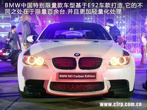 寶馬公司特別為中國提供111輛BMWM3碳纖限量版。除了裝備碳纖維車頂,還在前保險(xiǎn)杠下面的裙邊、后擾流板以及內(nèi)飾等部位使用碳纖維材質(zhì),讓卓爾不群的M3更加珍貴而富有個(gè)性。