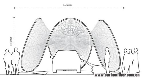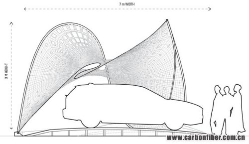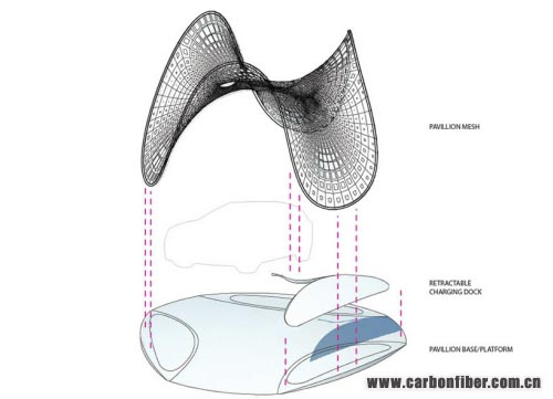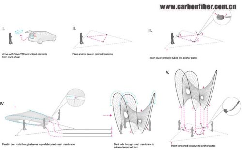 「純張力(PURE Tension)」是由Synthesis Design + Architecture,Buro Happold,和Fabric Images三家公司為沃爾沃的新款混合動(dòng)力車型V60設(shè)計(jì)的一款充電車篷,組裝簡單,便于攜帶,采用膜網(wǎng)結(jié)構(gòu),可以通過車篷上面的太陽能電池板為汽車充電。