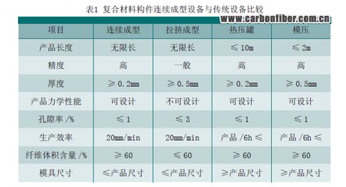 復(fù)合材料連續(xù)成型設(shè)備與傳統(tǒng)成型設(shè)備的比較見表1。連續(xù)成型設(shè)備不受場地和模具的限制,可在小型模具上通過連續(xù)固化成型生產(chǎn)大型、超長復(fù)合材料構(gòu)件。另外,該設(shè)備可通過成型前的自動裁剪-鋪疊系統(tǒng),實(shí)現(xiàn)具有鋪層設(shè)計(jì)的復(fù)合材料構(gòu)件的連續(xù)生產(chǎn),這與傳統(tǒng)的拉擠設(shè)備不同,同時可控制復(fù)合材料構(gòu)件的纖維體積含量。