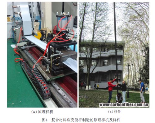 南京航空航天大學(xué)在復(fù)合材料構(gòu)件連續(xù)成型技術(shù)方案的基礎(chǔ)上初步研制了復(fù)合材料應(yīng)變能桿成型的原理樣機(jī)(圖4(a)),并試制了20m長應(yīng)變能桿(圖4(b))。