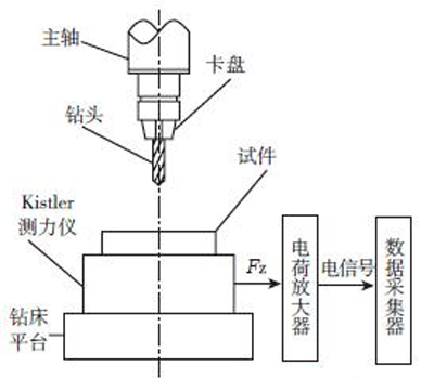 鉆削碳纖維增強(qiáng)復(fù)合材料,一般采用高轉(zhuǎn)速和低進(jìn)給量。本試驗(yàn)采用高速臺鉆Z4006A,具有1370r/min、3700r/min、6900r/min、10000r/min 四級轉(zhuǎn)速,滿足鉆削時(shí)高轉(zhuǎn)速的要求。為了全面研究各類工藝參數(shù)對鉆削軸向力和制孔質(zhì)量的影響,作者對該鉆床進(jìn)行了改進(jìn)。在鉆床上加上步進(jìn)電機(jī)實(shí)現(xiàn)鉆床自動(dòng)進(jìn)給功能,進(jìn)給量可大范圍調(diào)整。圖5為碳纖維增強(qiáng)復(fù)合材料鉆削軸向力測量平臺示意圖。