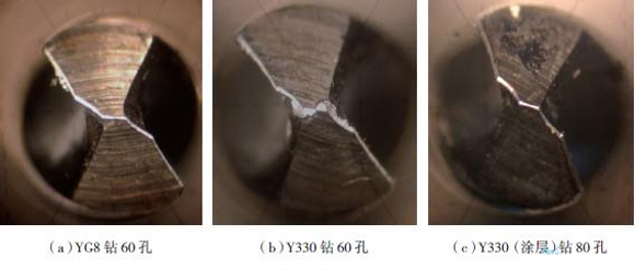 圖9為鉆削一定數(shù)量孔后3種鉆頭的磨損情況。從圖中可以看出,鉆削60孔后,Y330鉆頭磨損比較嚴(yán)重,YG8磨損量相對小些,Y330(涂層)鉆頭雖然所鉆孔數(shù)比較多(80孔),但磨損最小。