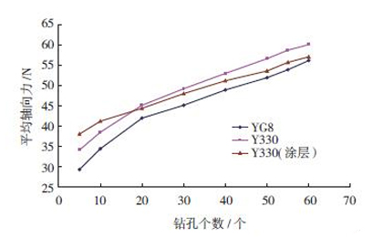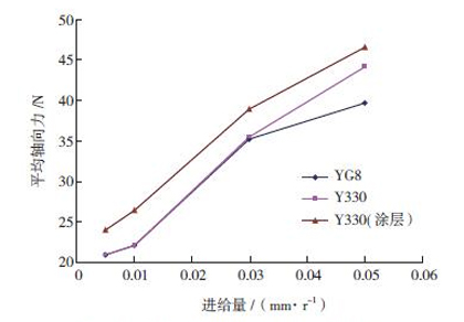 圖10為不同直徑的Y330( 涂層)刀具在相同鉆削參數(shù)下,鉆削碳纖維增強(qiáng)復(fù)合材料的平均軸向力曲線圖。