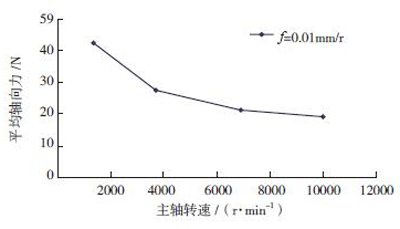 從圖中可以看出:軸向力隨著轉(zhuǎn)速的增加而呈現(xiàn)減小的趨勢,曲線的曲率隨著轉(zhuǎn)速的增加逐漸減小,在轉(zhuǎn)速超過6000r/min 后,曲線已經(jīng)變得很平緩。由于切削熱的存在,轉(zhuǎn)速越高,鉆削溫度越高,且高速下,對鉆床剛度要求也高。因此,轉(zhuǎn)速不宜太高,建議轉(zhuǎn)速取在3000~6000r/min范圍內(nèi),對于剛度好的機(jī)床,可以適當(dāng)提高轉(zhuǎn)速;對于剛度差的機(jī)床,可以適當(dāng)降低轉(zhuǎn)速。