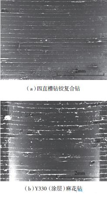 選用6.7mm四直槽鉆鉸復(fù)合鉆和6.0mmY330(涂層)麻花鉆進(jìn)行了試驗(yàn)。四直槽鉆鉸復(fù)合鉆鉆尖處沒有了阻礙切削的橫刃,有利于減小切削力,同時(shí)還能鉸孔,不僅精度高而且效率也高。圖11為電子顯微鏡下四直槽鉆鉸復(fù)合鉆與Y330(涂層)麻花鉆所鉆孔的孔壁形貌(n=1000r/min,f=0.056mm/r)。 123456