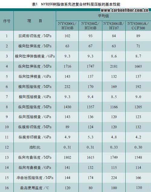 為提高和穩(wěn)定先進復合材料的成型質(zhì)量,降低先進復合材料的制造成本,我們根據(jù)不同的復合材料結(jié)構(gòu)件研制開發(fā)了中高溫度固化、韌性不同的NY9200環(huán)氧樹脂體 系,原材料均為國產(chǎn),價廉易購;其配制工藝簡單,質(zhì)量穩(wěn)定,可用于濕法或干法預浸,無污染,易工程化;其預浸料具有貯存期長,固化溫度帶寬,固化時間短等 優(yōu)點;其先進復合材料具有韌性和機械性能兼優(yōu)的特