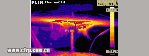 但是這是在沖擊發(fā)生后用10-15秒的紅外照相機拍攝到的照片;溫度等級圖表明洞四周的部分溫度已經(jīng)超過153°C,洞中間的碳纖維仍然在燃燒。