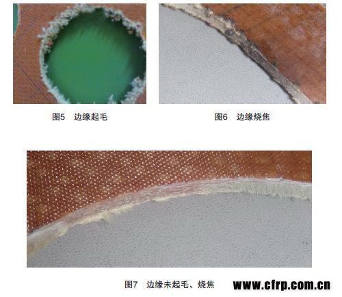 芳輪纖維目前是復合材料中機械加工最難的材料,特別容易分層、起毛。選用的刀具不合適,會使切割后的邊緣分層、起毛、燒焦等。如圖5、6、7所示。