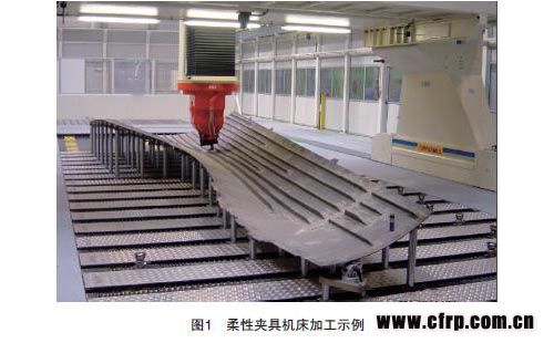 下面介紹一種配備柔性夾具的機床,此機床主要優(yōu)點是便于對各種形狀的大型復合材料零部件(玻璃纖維、碳纖維、芳綸纖維、Nomex蜂窩芯、鋁蜂窩芯等)的大批量邊緣銑切、制孔、開口等,生產(chǎn)效率高,經(jīng)濟效益顯著。真空吸盤式柔性夾具系統(tǒng)是一種根據(jù)數(shù)控鉆銑床發(fā)展起來的配套裝夾系統(tǒng),該系統(tǒng)的主要功能是可在三維空間將彎曲的工件按照預先設計的程序固定好,工件由在TORESMILL龍門設備的工作區(qū)域內(nèi)的真空吸盤固定。TORESTOOL通用支撐夾具可在2min內(nèi)自動重新配置,從針對一種工件的配置轉(zhuǎn)換成適應另外一種形狀工件的配置。特別適用于壁板零件的外形和孔的加工。因為避免了大量銑切夾具的制造和存放,可顯著降低成本并節(jié)約生產(chǎn)面積,從而被國外航空企業(yè)廣泛使用。國內(nèi)哈飛、西飛、成飛等廠也已引進。如圖1所示。