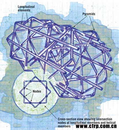 IsoTruss結(jié)構(gòu)公司(位于猶他州百翰城)首席技術(shù)官特雷西利文斯頓說,復(fù)合材料絕緣管束結(jié)構(gòu)(IsoTruss)在設(shè)計(jì)上與鋁或鋼制的廣播或電訊格塔十分類似。格子設(shè)計(jì)通常適用于耗材較少的結(jié)構(gòu),整個(gè)結(jié)構(gòu)的質(zhì)量只有實(shí)體結(jié)構(gòu)的一半,因而絕緣管束結(jié)構(gòu)可以被建造成高度較高的塔建筑。此外,絕緣管束結(jié)構(gòu)特有的開放式結(jié)構(gòu)還能有效降低塔或桿結(jié)構(gòu)的風(fēng)荷載。但是,金屬格子塔的最大局限性存在于必須通過手工完成每個(gè)單元結(jié)構(gòu)的裝配和固定,因此它們的造價(jià)非常昂貴。