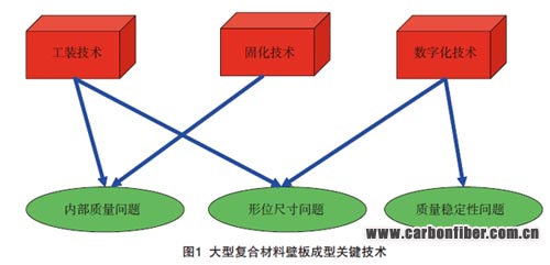 整體成型的大型復(fù)合材料壁板制件,針對其結(jié)構(gòu)特點以及存在的主要問題,其成型的關(guān)鍵技術(shù)主要有3個方面:工裝技術(shù)、固化成型技術(shù)、數(shù)字化技術(shù),如圖1所示。