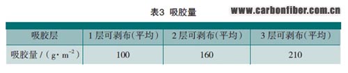 大型復(fù)合材料壁板因為厚度變化大,所以各個區(qū)域余膠量分布不均,在制件制備過程中則要通過預(yù)吸膠環(huán)節(jié)控制各個區(qū)域厚度在標(biāo)準(zhǔn)范圍之內(nèi),這就要求我們對預(yù)吸膠工藝進一步掌握。吸膠材料和吸膠時間是對吸膠量的關(guān)鍵影響因素,如表3和圖3所示。