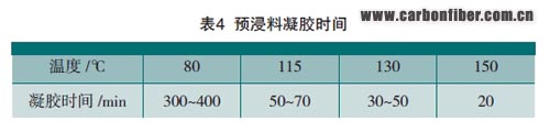 加壓點包括加壓溫度、加壓時機。加壓點的選擇, 首先是加壓溫度,加壓溫度過低則樹脂流動性不好,纖維不易均勻浸潤易造成缺陷;加壓溫度過高,樹脂聚合速率過快不易掌握加壓時機。其次在確定加壓溫度的前提下把握好加壓時機,加壓時機過早則樹脂粘度低,排出樹脂過多造成零件貧膠、孔隙率高;加壓時機過晚則樹脂聚合程度高,流動性差制件易夾雜氣泡產(chǎn)生疏松、分層等缺陷。加壓點的最佳選擇為樹脂由粘流態(tài)向高彈態(tài)轉(zhuǎn)變過程中的過渡區(qū)間。這和升溫速率、加壓溫度、加壓時機都密切相關(guān),不同的溫度—時間曲線有著不同的加壓點。目前經(jīng)常采用差熱分析儀和流變儀來了解樹脂的固化反應(yīng)過程和粘度變化過程,實際生產(chǎn)中也有用滑板法或拉絲法測定凝膠時間來了解樹脂在溫度—時間曲線各個點的粘度情況,如表4、表5所示。