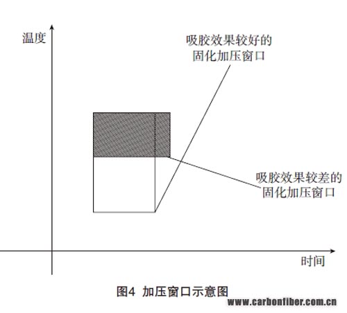 經(jīng)過試驗和工藝驗證,應(yīng)該轉(zhuǎn)變我們的工藝觀點,應(yīng)注重預(yù)成型工藝和吸膠效果。如果吸膠效果不好其坯料中的揮發(fā)份、氣體就不能有效排除,那么在固化過程中隱患比較大,固化工藝的選擇尤為嚴(yán)格,某種意義上講其加壓窗口范圍更小。而反之若預(yù)成型工藝效果理想,坯料中的揮發(fā)份、氣體有效排除,結(jié)構(gòu)密實,那么固化過程中出現(xiàn)問題的機率較小,固化工藝相對比較好控制,對加壓時機不那么敏感,尤其是提早加壓對零件固化質(zhì)量影響不大,一定程度上反而是拓寬了加壓窗口,如圖4所示。