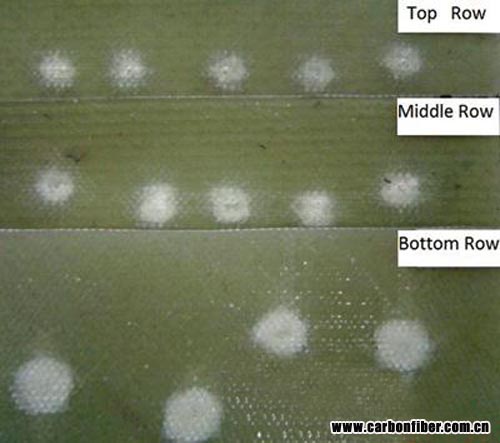 圖3 在采用鉤/環(huán)搭接的“互鎖型”Han-3D玻璃纖維織物(上)以及具有同樣重量的“非互鎖型”平織玻璃纖維織物(下)上所做的低速碰撞測(cè)試,兩種織物都是按0°、+45°、-45°、90°、0°、-45°、+45°和0°的順序依次鋪層、并由亨斯邁先進(jìn)材料公司的Aradur 5003-1環(huán)氧樹(shù)脂進(jìn)行真空灌注的一個(gè)8層織物。將試樣放入一個(gè)中心孔直徑為50mm的試驗(yàn)夾具中,采用一個(gè)頭部直徑為12.7mm的沖擊桿在試樣的多處擊打數(shù)次(落錘1kg,落差80cm)??梢钥闯?,采用Han-3D織物生產(chǎn)的復(fù)合材料上的凹痕相對(duì)較小,中間一排顯示出了僅在試驗(yàn)夾具的落差由80cm降低到40cm后,平織的試樣上就出現(xiàn)了較小的凹痕印記