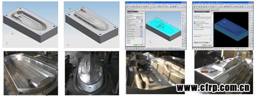 如圖3所示為對(duì)該艇身smc模壓成型的模具設(shè)計(jì)、模具數(shù)控加工編程以及模具實(shí)物。該模具結(jié)構(gòu)為封閉式、油循環(huán)加熱成型艇身。此種結(jié)構(gòu)較開放式、電加熱型模具,其產(chǎn)品重量可以嚴(yán)格控制、無(wú)飛邊、壁厚一致性好、加熱均勻、維修維護(hù)方便、模壓能耗低等多種優(yōu)點(diǎn)。模具設(shè)計(jì)最主要的為凸凹模凸凹模之間的接口配合設(shè)計(jì)對(duì)溢料飛邊的影響、加熱系統(tǒng)的設(shè)計(jì)、頂出機(jī)構(gòu)與模具的表面光潔度與修配余量的控制。